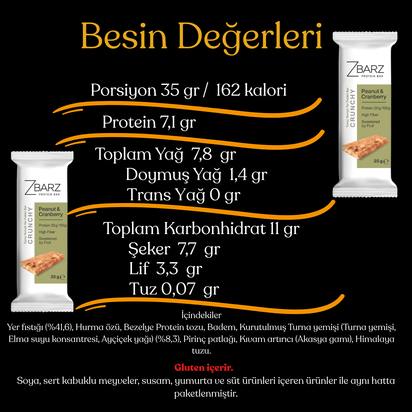 Gluten içerir. Alerjenler koyu renk ile yazılmıştır. Soya, sert kabuklu meyveler, susam, yumurta ve süt ürünleri içeren ürünler ile aynı hatta paketlenmiştir.