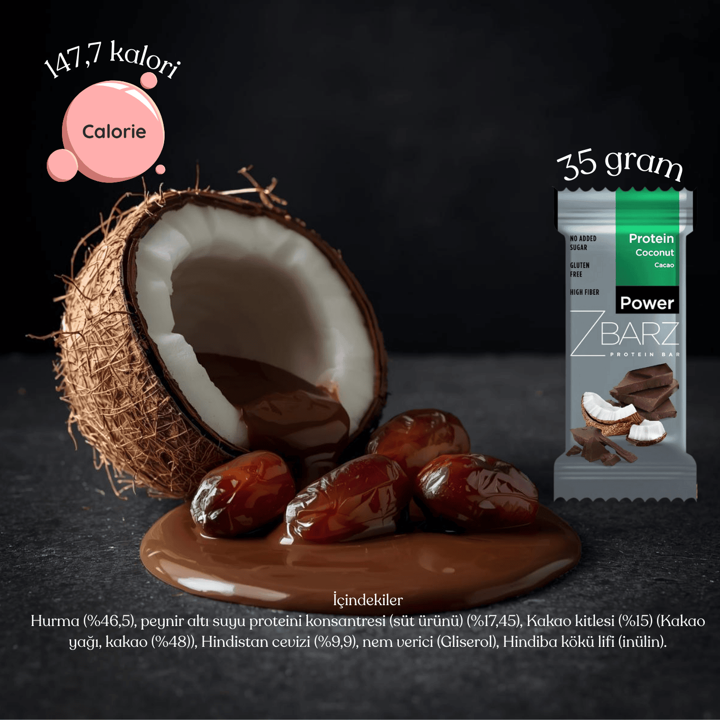 Hurma (%46,5), Peynir Altı Suyu Proteini Konsantresi (Süt Ürünü) (%17,45), Kakao Kitlesi (%15) (Kakao Yağı, Kakao (%48)), Hindistan Cevizi (%9,9), Nem Verici (Gliserol), Hindiba Kökü Lifi (İnülin).