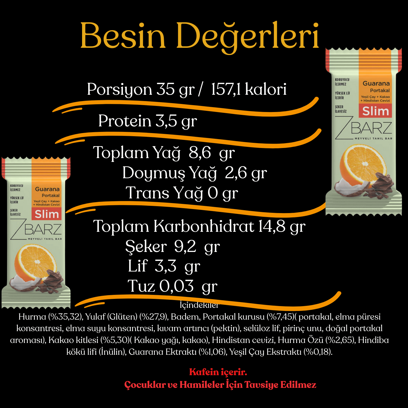 Hurma (%35,32), Yulaf (Glüten) (%27,9), Badem, Portakal kurusu (%7,45)( portakal, elma püresi konsantresi, elma suyu konsantresi, kıvam artırıcı (pektin), selüloz lif, pirinç unu, doğal portakal aroması), Kakao kitlesi (%5,30)( Kakao yağı, kakao), Hindistan cevizi, Hurma Özü (%2,65), Hindiba kökü lifi (İnülin), Guarana Ektraktı (%1,06), Yeşil Çay Ekstraktı (%0,18).
