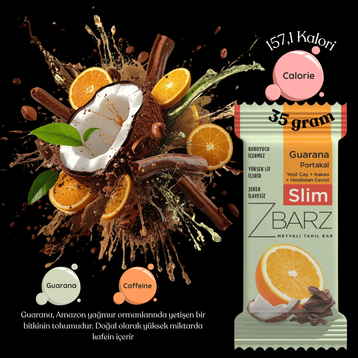 Portakal , Badem, Hurma, Hindistan Cevizi, Yeşil Çay ve Guarana gibi özenle seçilmiş içerikleri bir araya getiren Slim Guarana Portakal, hafif ve lezzetli bir seçim arayanlar için ideal bir alternatiftir.